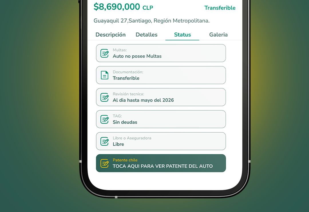- Muestra detallada de la documentación del auto, en patente Chile y en documentos directos con el dueño.