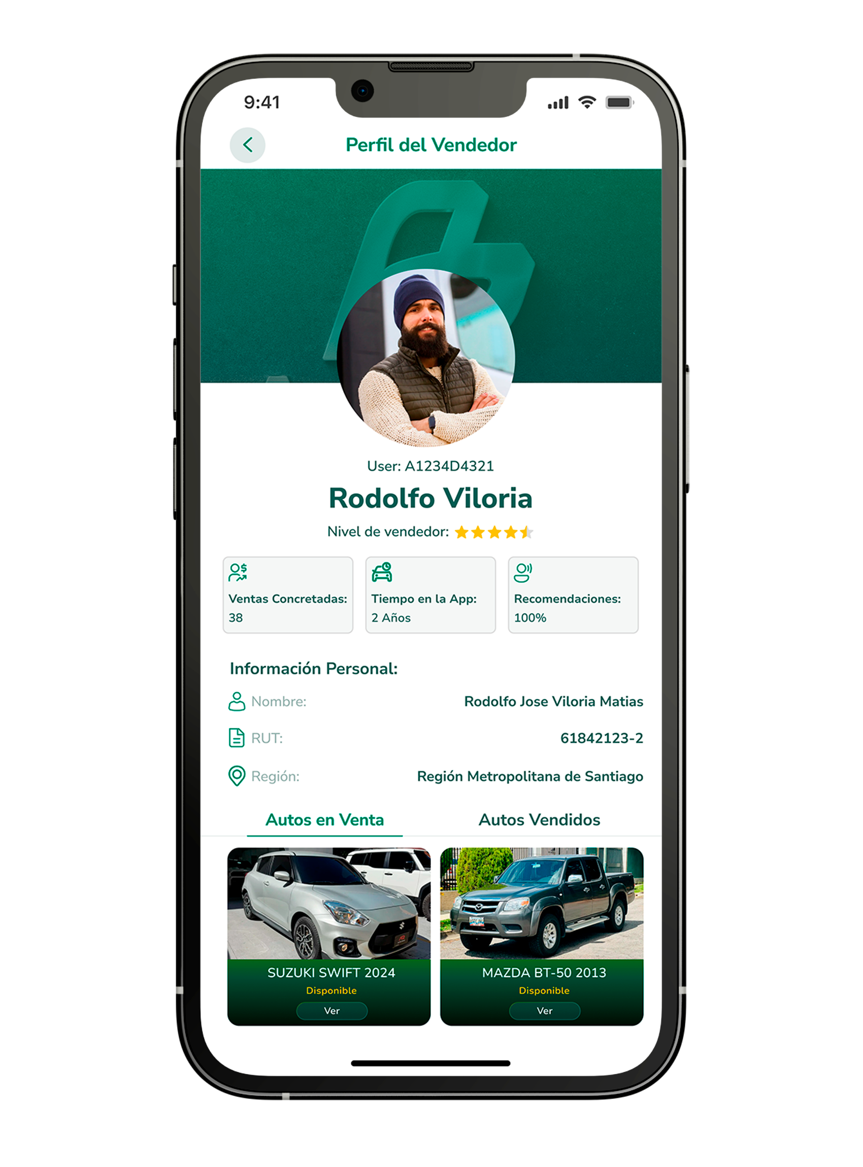 Se diseñó un perfil detallado donde se muestran las ventas concretadas, concesionario y valoraciones. Esta funcionalidad potencia la confianza y ayuda al comprador a tomar decisiones informadas.